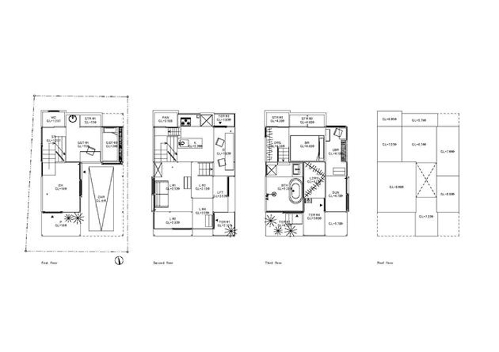 Une mini maison urbaine tout en verre et acier blanc est comme chaque maison conventionnelle, un compromis entre pièces de vie communes, comme la cuisine, salle de séjour, placées sur le devant ou au centre, et pièces de vie privée, comme les chambres, la salle d’étude ou la salle de bain, placées en arrière ou au sommet et cachées de la vue extérieure.